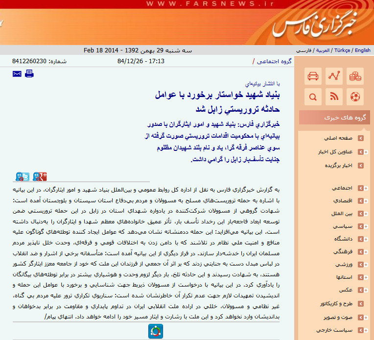 خبرگزاری فارس: بنیاد شهید و امور ایثارگران با صدور بیانیهای با محکومیت اقدامات تروریستی صورت گرفته از سوی عناصر فرقه گرا، یاد و نام بلند شهیدان مظلوم جنایت تأسفبار زابل را گرامی داشت.