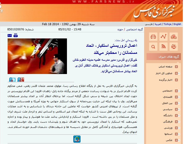 اتحاد بیشتر مسلمانان میافزاید. وی با بیان اینکه این جنایت بیرحمانه از سوی استکبار جهانی به ویژه آمریکا و همدستانش صورت گرفته است، از نیروهای امنیتی کشور خواست که عاملین این حادثه دردناک را شناسایی و به اشد مجازات برسانند. این روحانی اهل سنت با اشاره به اینکه اعمال غیر اسلامی و انسانی تنفر و انزجار ملت شریف ایران و ملل مسلمان را در پی داشته است ، افزود: استکبار و ایادیاش بدانند ملت ما هوشیار و بیدار بوده و اجازه نمیدهند که استکبار با اعمال تروریستی خود به اهداف شوم و پلیدشان دست یابند. وی خواستار اتحاد و همبستگی، هوشیاری و آمادگی کامل در مقابل دسیسه ها و شیطنتهای دشمنان قسم خورده اسلام شد.